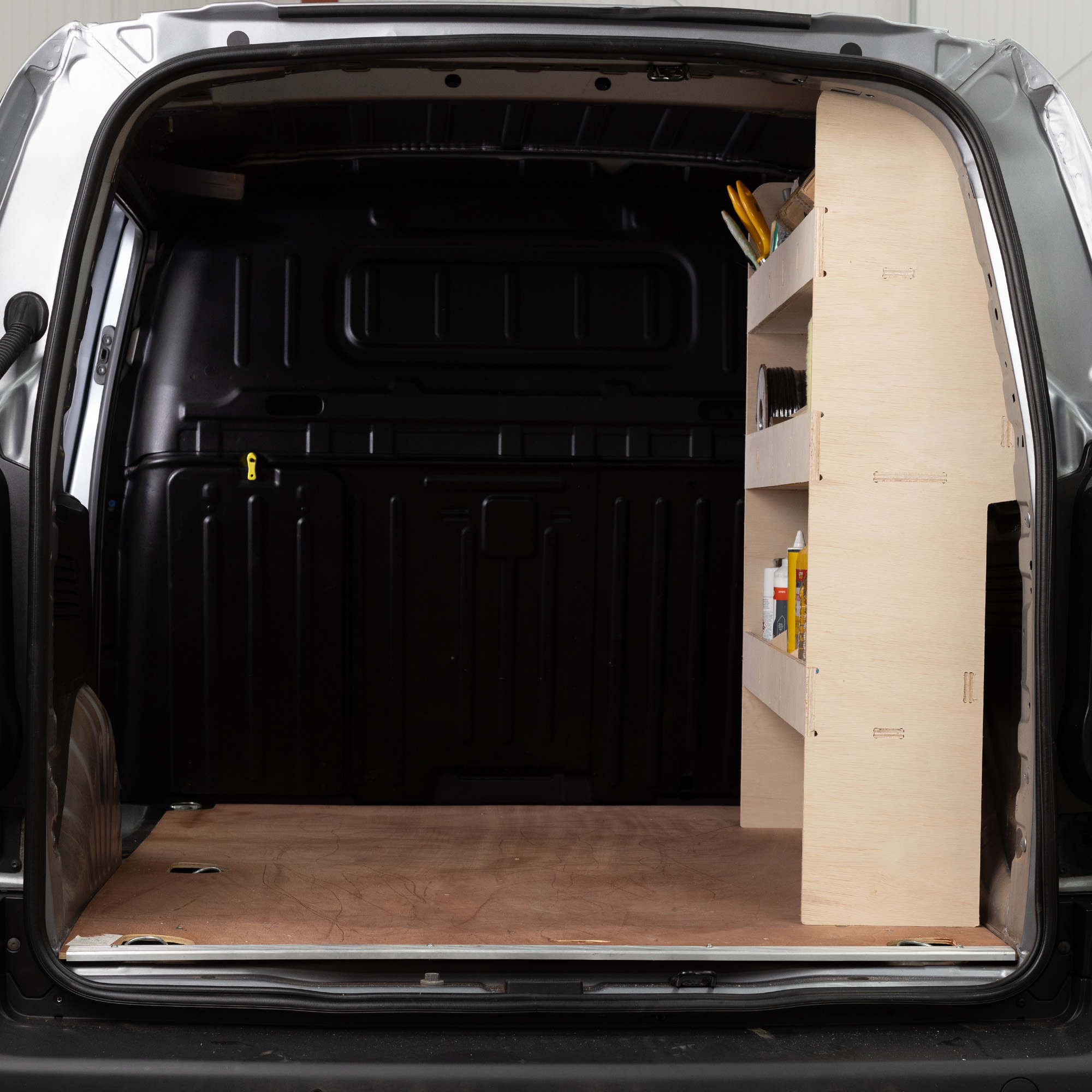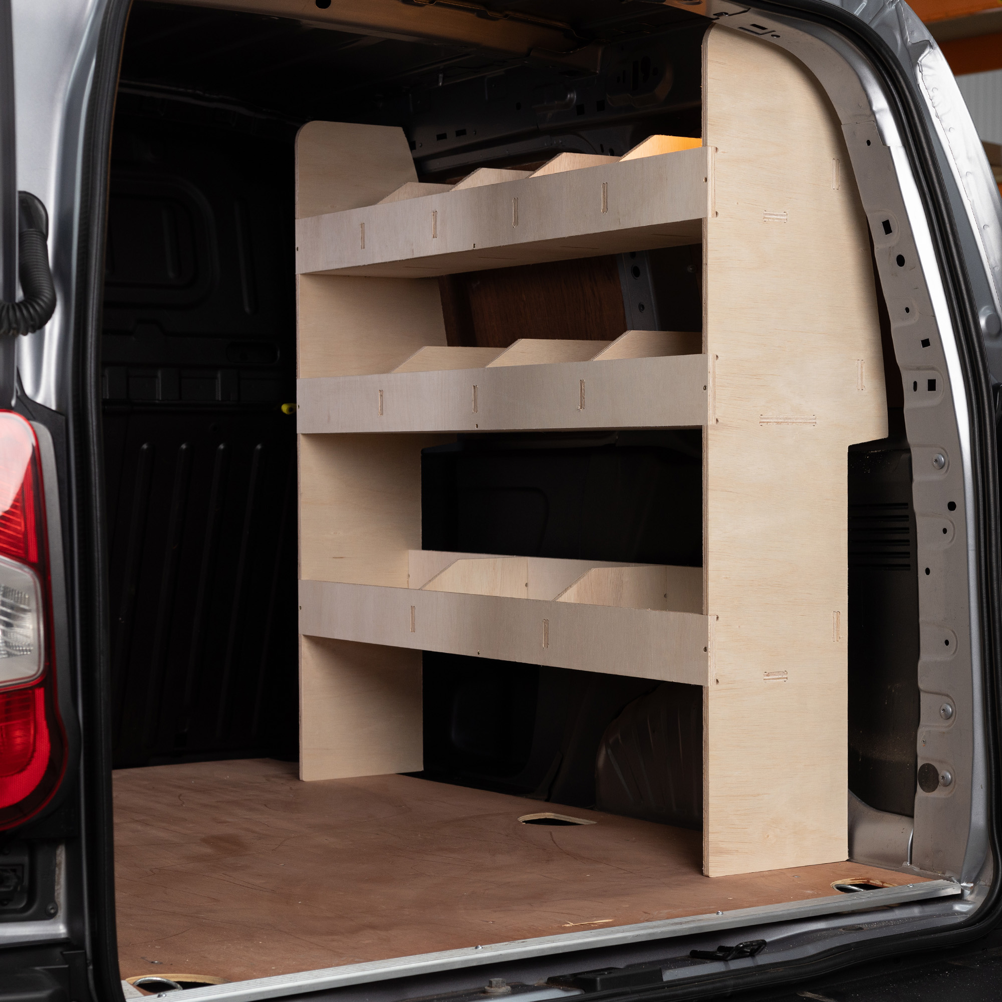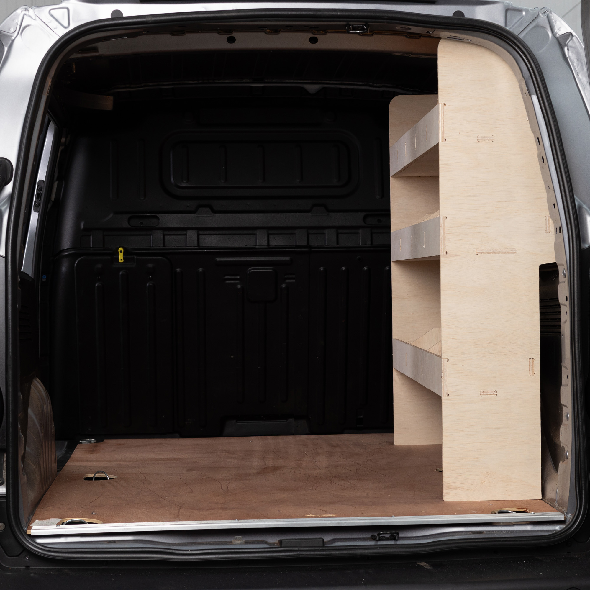A van racking system to fit a Citroen Berlingo M (L1) 2019+. This product consists of a modular shelving unit designed to fit the driver side of the van.