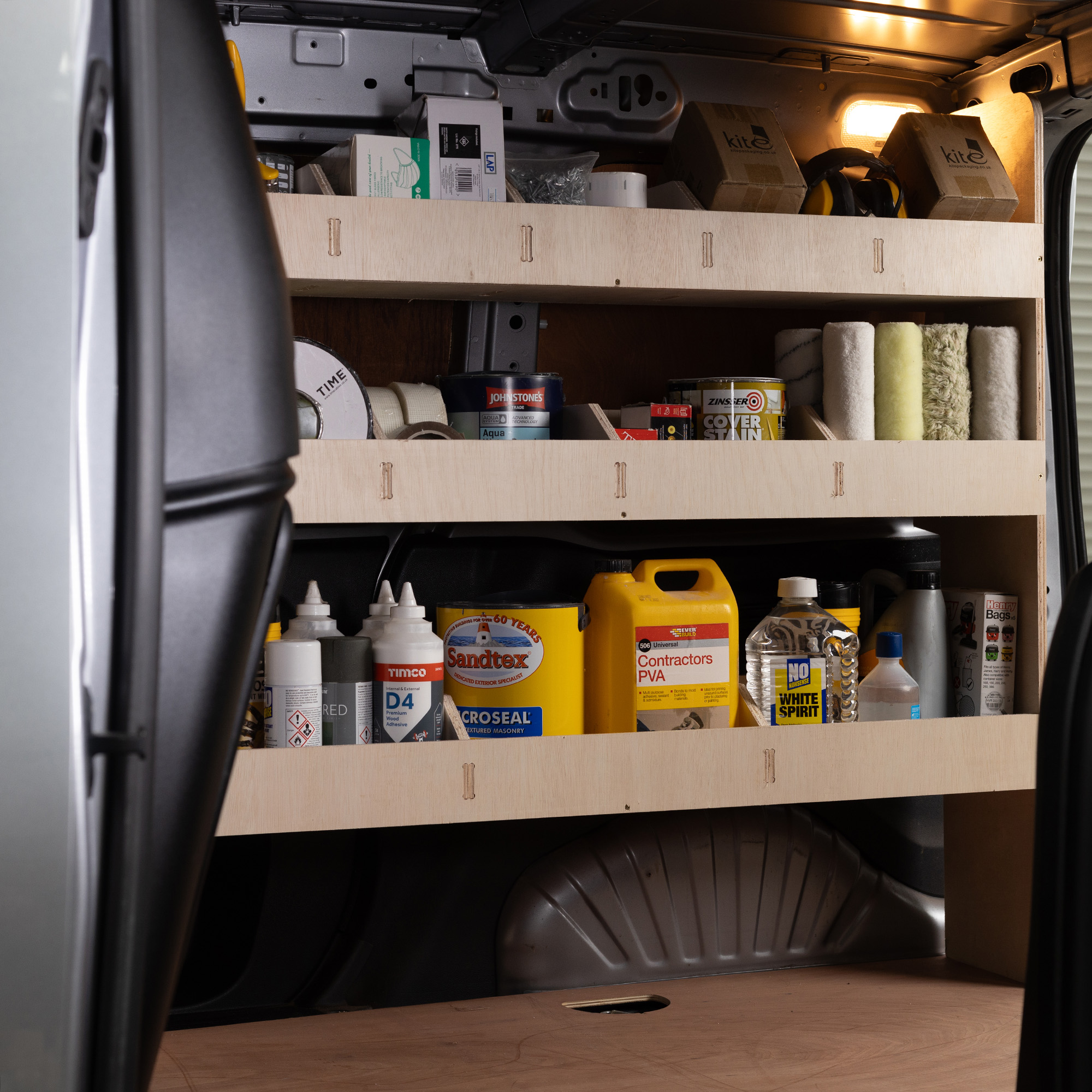 3 shelves with 12 storage compartments provide a tremendous amount of space to easily store, organise, and access all of your tools, equipment and supplies. Our van racking makes it easy to find exactly what you need, when you need it.
