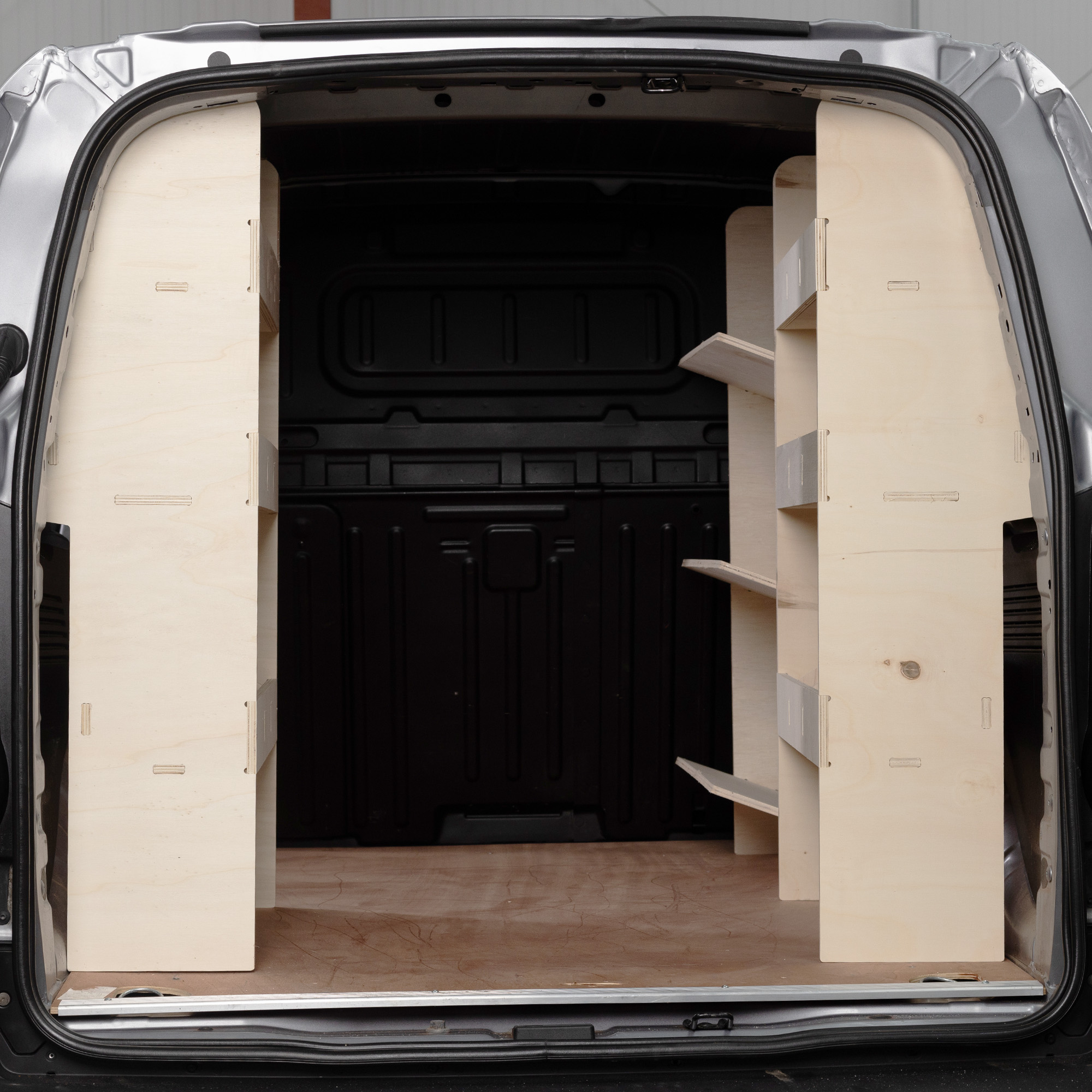 A van racking system to fit a Ford Transit Connect L1 2024+. This product consists of 3 modular shelving units, 2 that fit the full driver side of the van and one for the passenger side. This is a complete van racking system that fully maximises the storage capacity of your van.