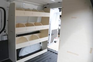 A van racking system to fit a Renault Kangoo Maxi 2008-21. This product consists of 2 modular shelving units one for either side of the van.
