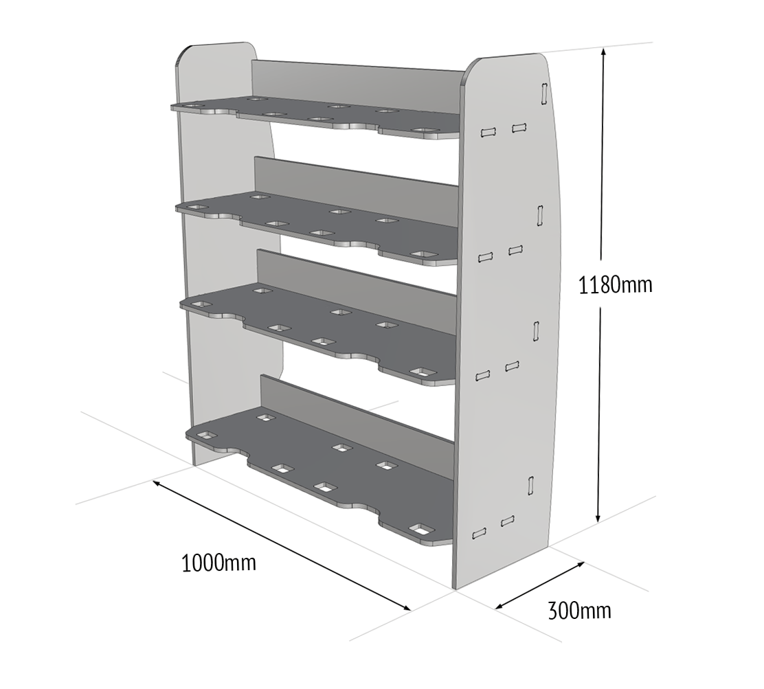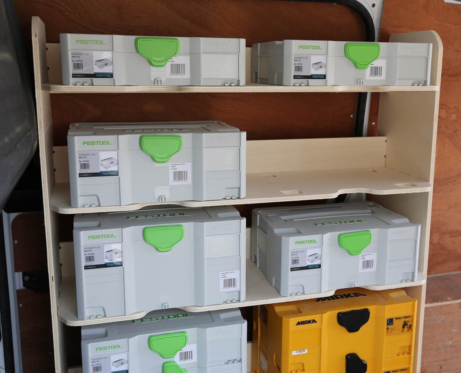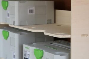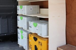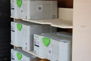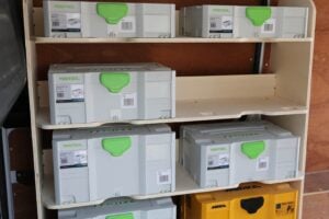4 shelves each with the capacity for 2 Festool containers provide a tremendous amount of space to easily store, organise, and access all of your tools, equipment and supplies. Our van racking makes it easy to find exactly what you need, when you need it.